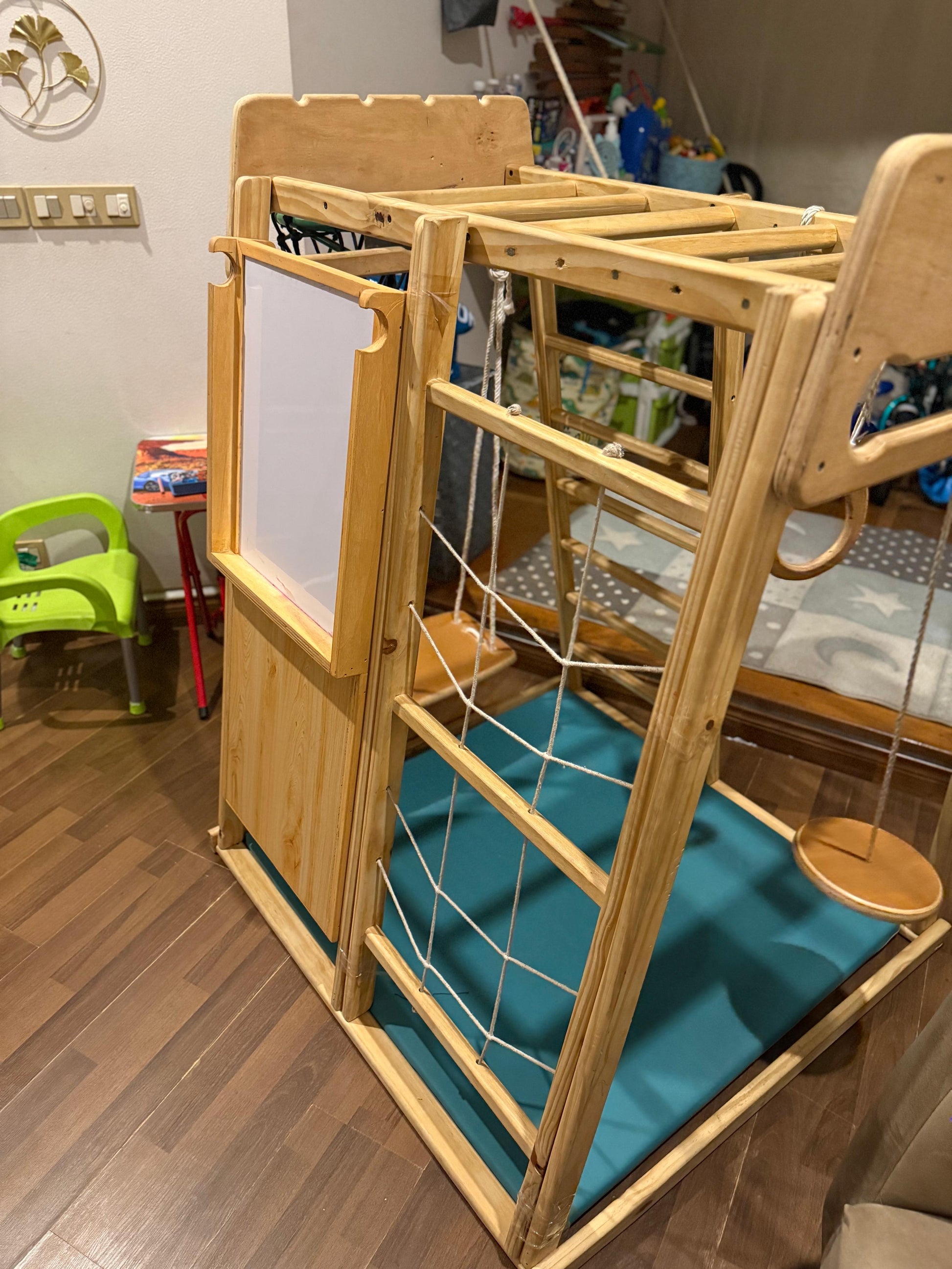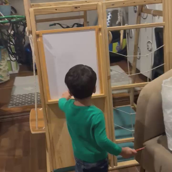 Turn your Jungle Joy into an even more exciting play gym with our smooth, sturdy dual-sided add-on slide. One side is a classic wooden slide for joyful movement; flip it over and you get a whiteboard surface for scribbling, drawing, and creative play.